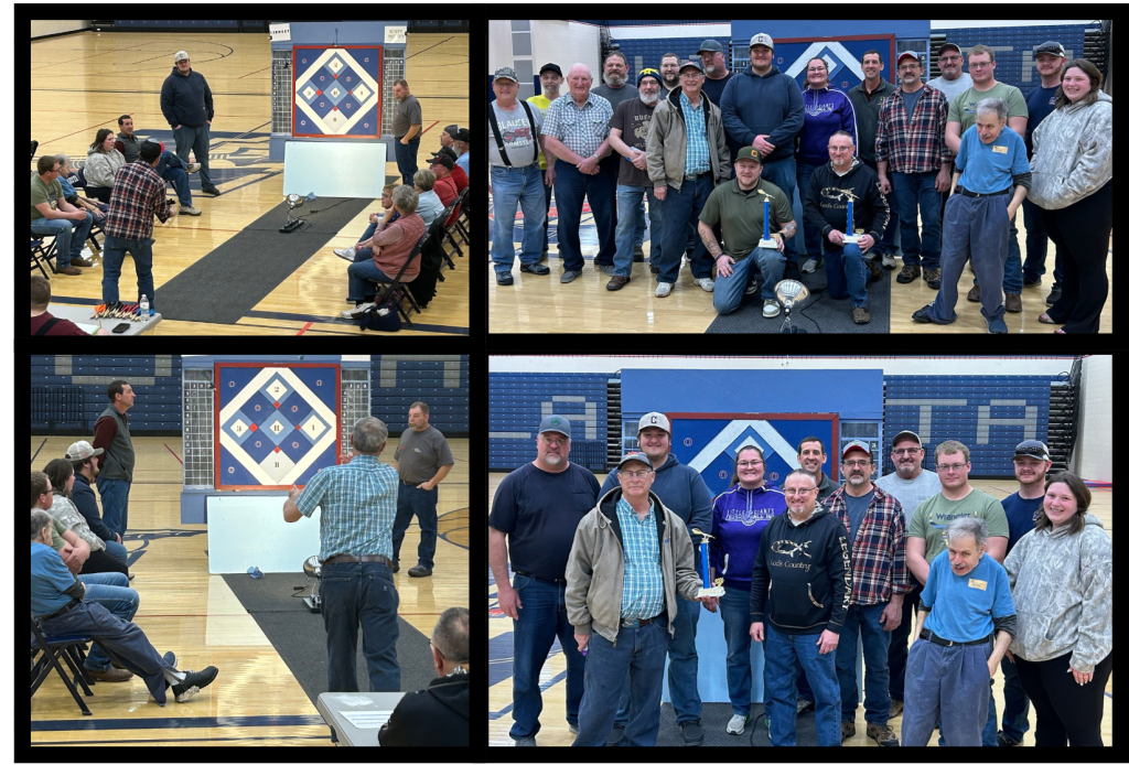 Pictured: Top left – Mike Joseph throwing a dart. Bottom left – Larry Hasselbach throwing a dart. Top right – Lindsey Trinity and Helena teams with 1st and 2nd place trophies. Bottom right -Lindsey Trinity team.